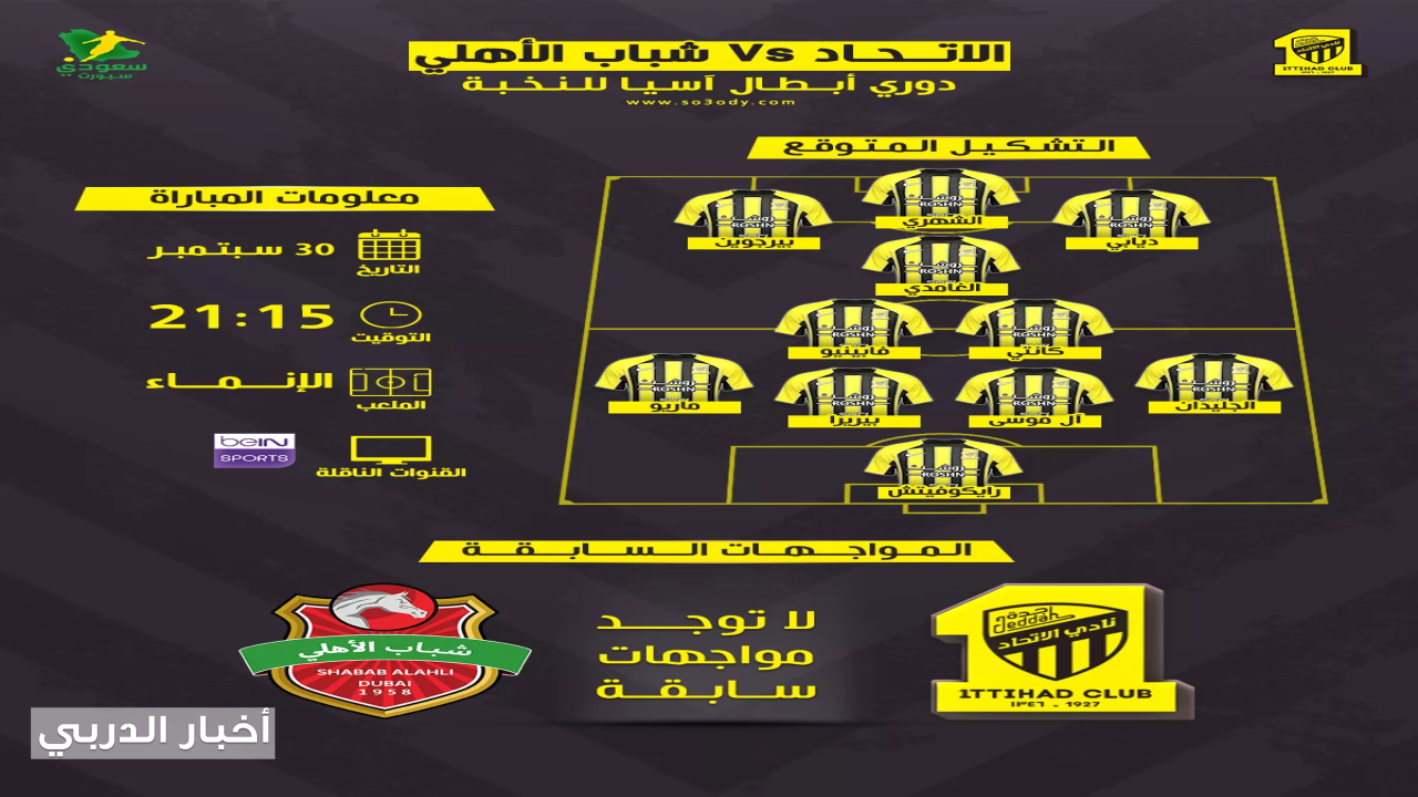 سيتم نقل مباراة الاتحاد ضد شباب الأهلي في بطولة دوري أبطال آسيا للنخبة عبر شاشة مجموعة قنوات "بي إن سبورتس" الرياضية.