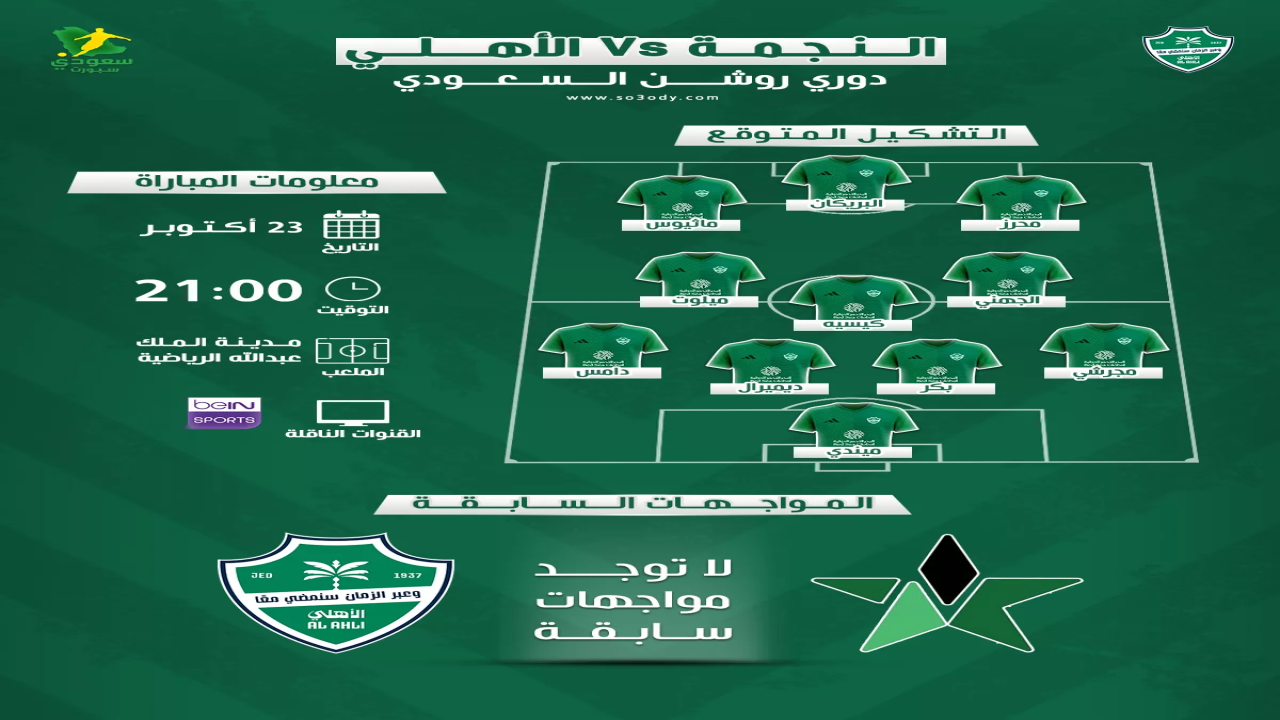 من المقرر أن يستضيف فريق النجمة نظيره الأهلي مساء يوم الخميس الموافق 23 أكتوبر 2025، وذلك ضمن منافسات الجولة السادسة من دوري روشن السعودي للمحترفين.