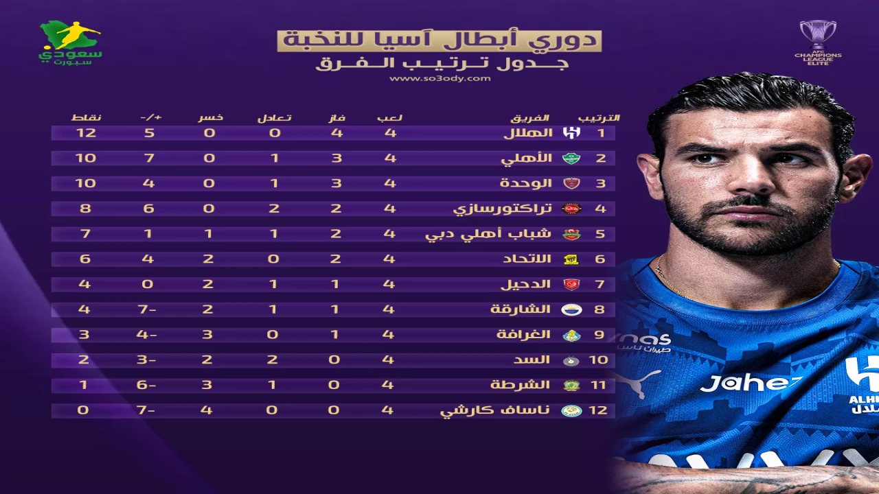 وقد تمكن نادي الهلال السعودي من الحفاظ على صدارة ترتيب البطولة بعد نهاية الجولة الرابعة، حيث يمتلك الفريق في رصيده 12 نقطة كاملة، محققًا العلامة الكاملة حتى الآن.
