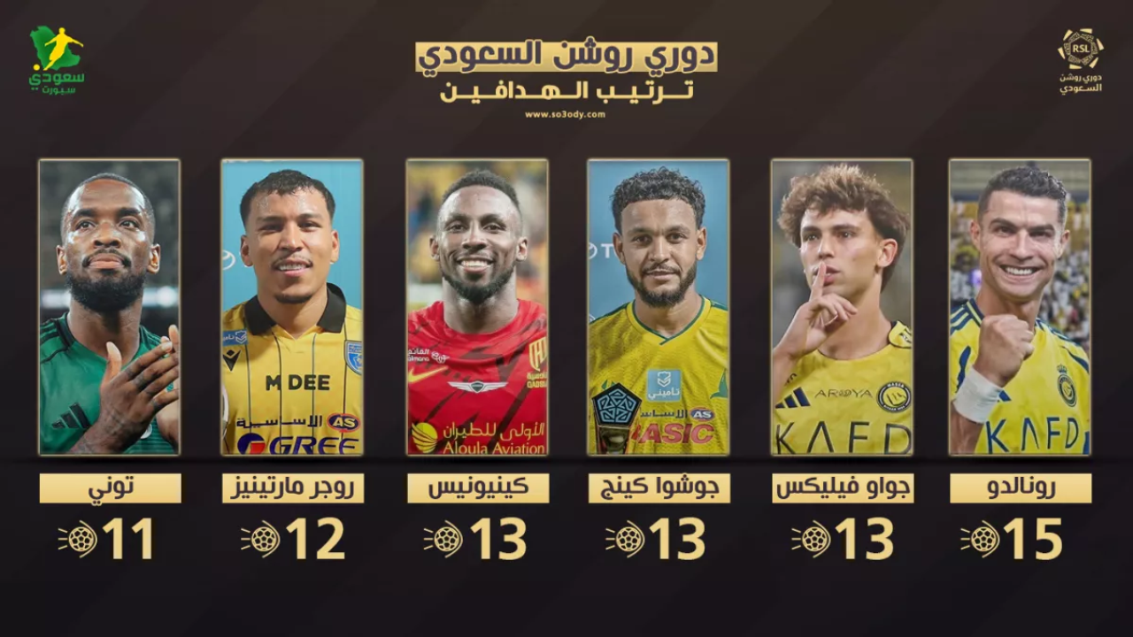 ويواصل البرتغالي كريستيانو رونالدو، الحفاظ على صدارة ترتيب هدافي دوري روشن برصيد 15 هدفًا.