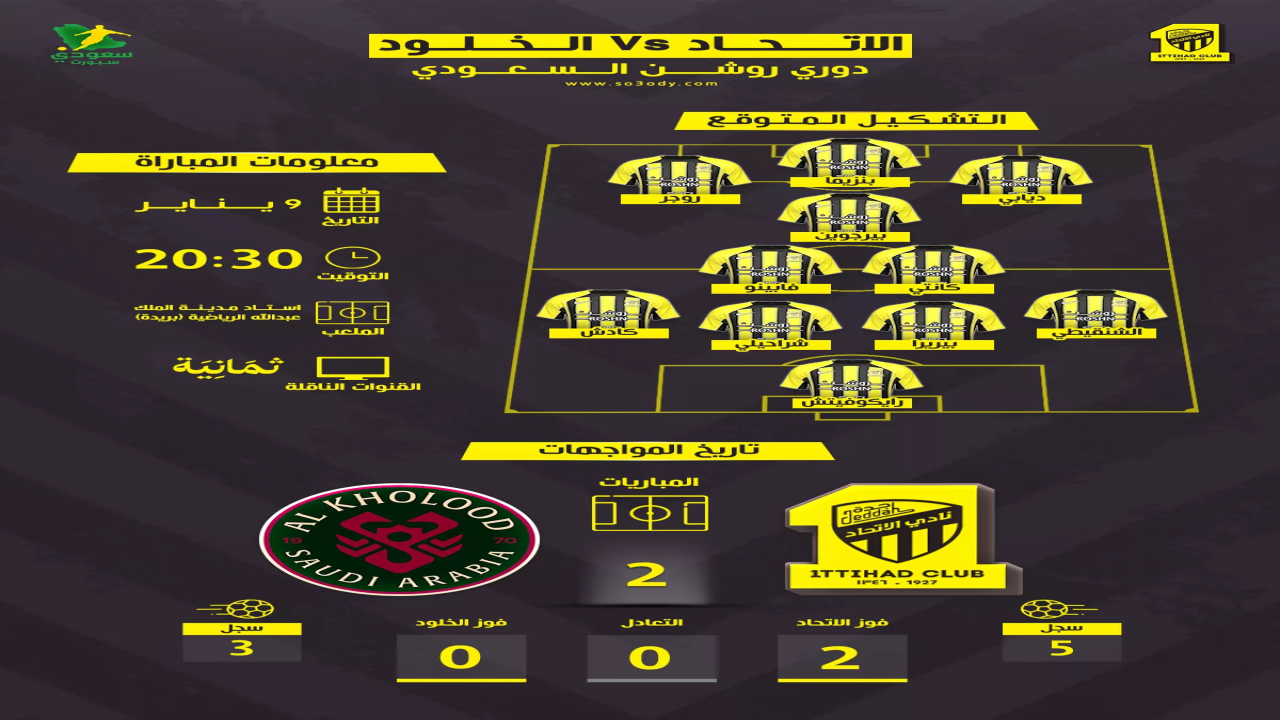 تقرر إقامة المواجهة المرتقبة بين الاتحاد والخلود مساء اليوم الجمعة، الموافق 9 يناير 2026، حيث يحتضن استاد مدينة الملك عبدالله الرياضية في بريدة أحداث هذا اللقاء.
