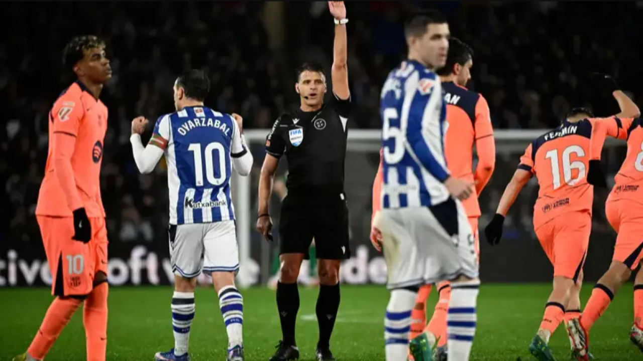 شهد الشوط الثاني تدخل تقنية الفيديو لتحويل إنذار كارلوس سولير إلى طرد مباشر بعد تدخل عنيف على قدم بيدري، وهو القرار الوحيد الذي لاقى قبولًا نسبيًا. كما أثار توزيع مانزانو لست بطاقات صفراء للاعبي سوسيداد خلال الوقت بدل الضائع موجة من الاحتقان، إذ اعتبر الجانب الكتالوني أن الحكم افتقد للمعايير الانضباطية، ما أثر بشكل مباشر على نتيجة المباراة وأداء المتصدر.