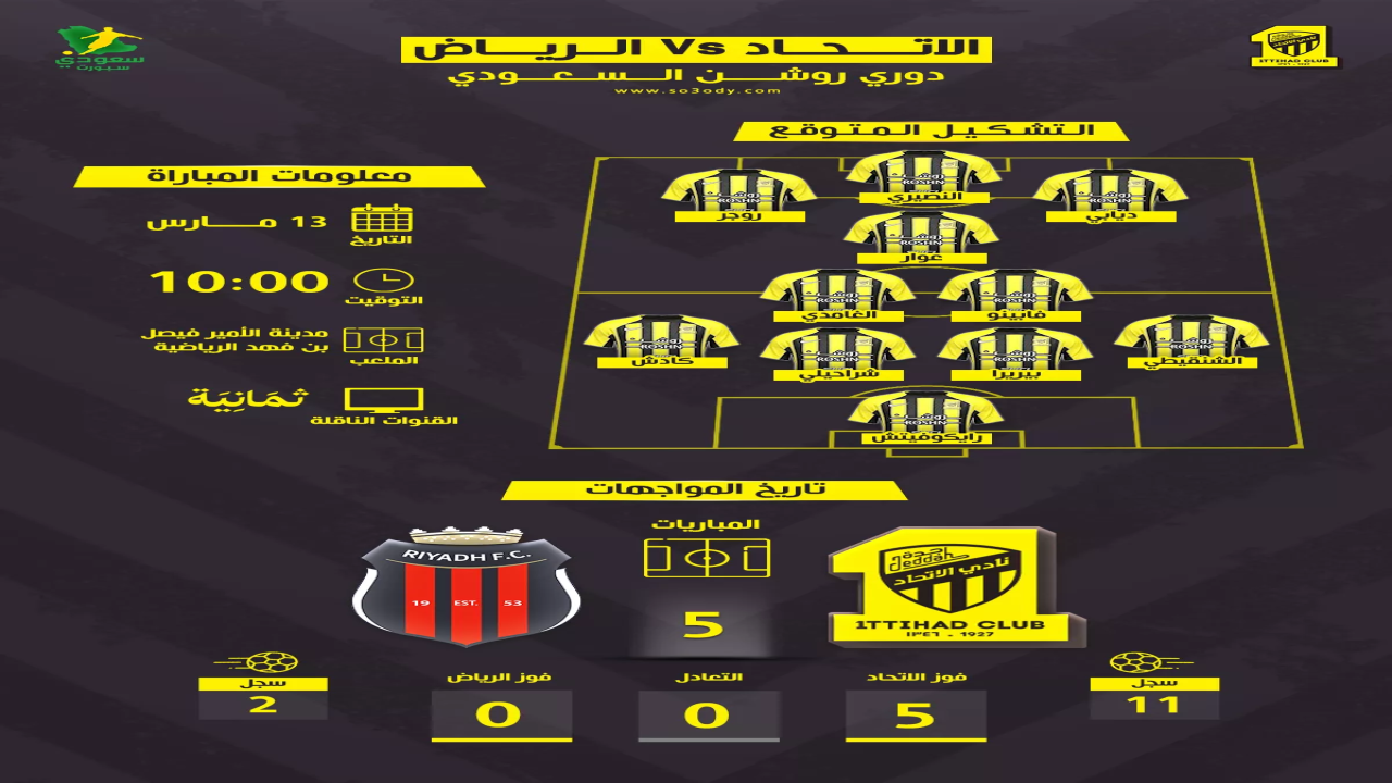 يحلّ الفريق الأول لكرة القدم بنادي الاتحاد ضيفاً على نظيره نادي الرياض، في مواجهة مرتقبة تجمع الفريقين مساء غدٍ الجمعة، الموافق 13 مارس 2026.